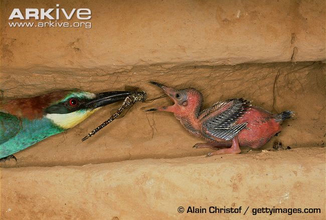 Подорослішавши, пташенята виходять в коридор назустріч батькам, а відтак відпадає потреба йти до самої гніздової камери. З часом в норі накопичується досить товстий шар пелеток і хітинових залишків комах. Сидячі в цьому бруді пташенята сильно страждають від паразитів; найслабші з них нерідко гинуть, причому їх трупи теж залишаються в гнізді. В останній тиждень кожне пташеня отримує їжу 30-80 разів на день, з'їдаючи 7-12 г корму. Через місяць після вилуплення молодь покидає гніздо і, сівши на сімейне сідало, спостерігає за дорослими, переймаючи у них навички полювання. Дорослі ще близько місяця діляться з молоддю їжею, а у перелітних популяцій підгодівля молоді триває аж до початку міграції. На наступний рік молоді бджолоїдки, що знайшли собі пару, виводять власне потомство.