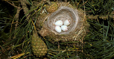 Гніздиться окремими парами. Гніздо облаштовує найчастіше в розвилці верхніх густих гілок ялини або ж біля самого стовбура, дуже рідко - на березі і сосні, високо над землею (від 5 до 15 м). Гніздо за формою нагадує невелику щільну напівкулясту споруду, здебільшого, майстерно замасковану зеленим мохом і шматочками лишайника, вплетеними в стінки. Основним будівельним матеріалом служать тонкі сухі гілочки, корінці, стеблинки трав, мохів, волокна лубу. Споруджуючи гніздо, цей матеріал птах переплітає і міцно скріплює павутиною, нитками коконів метеликів, а відносно неглибокий лоток вистилає пір'ям, волосом, вовною, рослинним пухом. У повній кладці буває переважно 4-5 яєць. Вони досить мінливі за величиною, формою, забарвленням. Шкаралупа матова, блідо-блакитна або блідо-зеленувато-блакитна. По ній розкидані цятки та рисочки червоно-бурого і темно-коричневого кольору. Перші свіжі кладки з'являються на початку травня, однак пік розмноження припадає на його середину. У році у більшості пар буває два виводки. Другу кладку можна спостерігати на початку другої половини червня. Насиджує протягом 12-14 діб самка. Її в цей час підгодовує вмістом вола самець. Молодняк залишає гніздо через 13-17 днів.