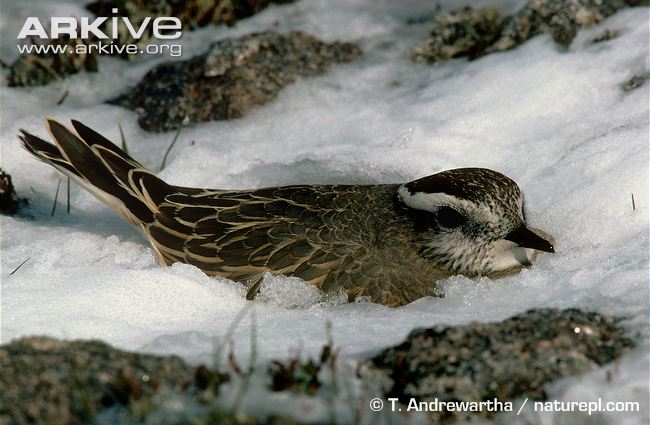 Дорослий птах y весняному оперенні. Верх голови чорний, на лобі пера з білими краєчками. Брови і їх продовження, що окреслює ззаду потилицю, білого кольору. Оперення решти верхньої сторони тіла сіро-буре з вохристими торочками. Горло біле. Воло сіро-буре з поперечною нечіткою струменястістю, від грудей воно відділяється двоколірною, спереду вузькою і неповною чор-нобурок», а ззаду ширшою білою, півмісячною смугою. Груди і боки іржасто-руді. На середині черева є велика чорна пляма. Задня частина черева і спід хвоста та крила білі. Махові пера сіро-бурі, стрижень і зовнішнє опахало першого махового пера також білі, тільки вздовж самого краю опахала тягнеться бура риска. Рульові пера такого кольору, як і спина, зовнішні пари з білими кінцями. Дзьоб чорний, ноги жовтуваті.