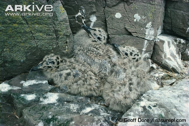 Гніздяться найчастіше колоніями, що складаються від кількох десятків до кількох тисяч пар, однак можуть гніздитися і поодинці. Птахи або займають старі, минулорічні гнізда, або будують нові, але так чи інакше його влаштовують на відкритому місці, зазвичай на землі - на скелястому березі моря, урвищі, в піщаних дюнах, на купині, рідше в заростях густої трави. Будівництвом займаються обидва члени пари, в якості матеріалу використовуючи, знайдений поряд рослинний матеріал - залежно від місця розташування, це можуть бути водорості (фукус (Fucus)), вегетативні частини злаків (ковила, пирій, типчак), зостера (Zostera), осока, лишайник , мох, невеликі гілочки дерев, тощо. Зсередини гніздо може бути вистелено пір'ям або вовною тварин. Іноді гніздо являє собою просту лунку в землі, вистелену черепашником. Самка, зазвичай, відкладає яйця один раз за сезон: у квітні - на початку червня в залежності від регіону. Розмір кладки, зазвичай, становить 2-3 яйця. Загальне тло яєць варіюється в межах від блідо-коричневого до зеленувато-блакитного. Також, зазвичай, є малюнок у вигляді глибоких плям, які можуть бути блідо-сірими або коричнево-фіолетовими. Змінюючи один одного через певні проміжки часу, насиджуванням займаються обидва батьки. Яйця періодично перевертаються за допомогою рухів ніг і тіла. Інкубаційний період складає 28-30 днів. Пташенята, якій щойно вилупились, покриті буро-сірим пухом з темними плямами. У першу добу вони повністю безпорадні, а на другу вже здатні підніматися на ноги і приймати їжу, а через 3-4 дні залишають гніздо і тримаються неподалік, у разі небезпеки ховаючись серед каменів або на воді. На крило пташенята підіймаються через 38-45 днів, але ще протягом місяця або півтора повністю залежать від батьків, які їх по черзі годують. Статева зрілість молодих птахів настає за 5-6 років.
