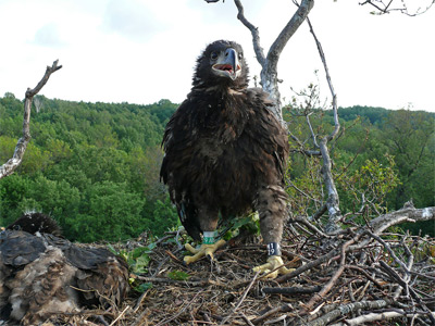 Перші яйця з'являються в гніздах з кінця квітня, найчастіше — протягом першої декади травня. У повній кладці звичайно два яйця, зрідка одне, але конкретних даних про такі кладки не наводить . Насиджувати починають після відкладання першого яйця і протягом 42—44 діб. Насиджує дуже старанно переважно самка, самець — значно менше. Якщо насиджена кладка гине, другої того самого року птахи звичайно не відкладають. Пташенята з'являються наприкінці першої декади червня. Інтервал між вилупленням першого і другого пташеняти становить кілька днів, тому друге пташеня дуже відстає у розвитку, часто гине само або його вбиває старше. У виводках, як правило, один, зрідка два молоді птахи. Виховують пташенят обидва птахи. Молоді перебувають у гнізді близько двох місяців. Ще не вміючи літати, вибираються з гнізда на сусідні з ними гілки і лише у віці близько 2,5 місяця починають літати. Це припадає переважно на середину серпня. Молоді птахи, що покинули гніздо, разом із старими тримаються лісів, але іноді залітають і в степову місцевість. Відліт місцевих гніздових птахів починається восени, з другої половини вересня, відбувається повільно .