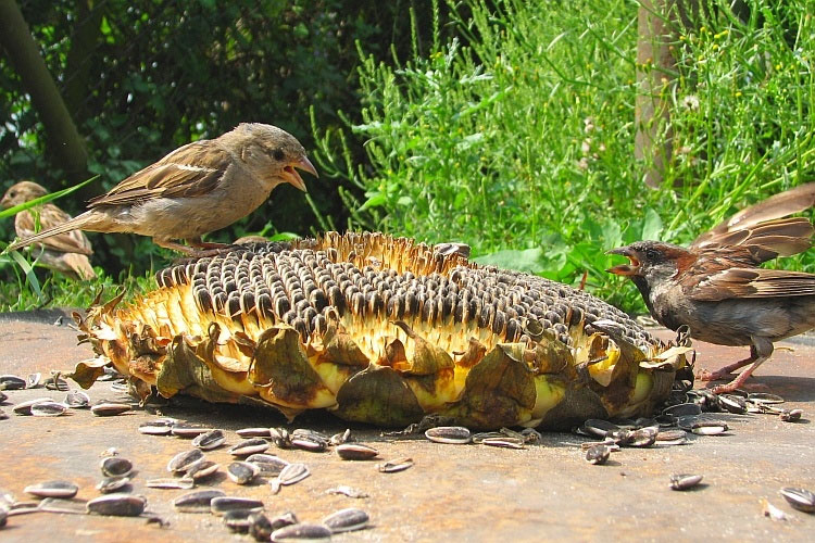 Насіння соняшника — жирний корм, яким живляться переважно птахи, що мають міцний дзьоб. Слабшим птахам насіння слід кришити. Згодовувати насіння соняшника треба тільки в сирому вигляді, бо смажене погано перетравлюється. Годувати птахів цим кормом слід обачно, з оглядом на його високу жирність. Пшеницю, жито, ячмінь, кукурудзу в зерні дають птахам подрібненими в суміші.